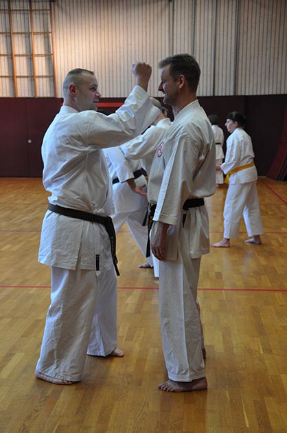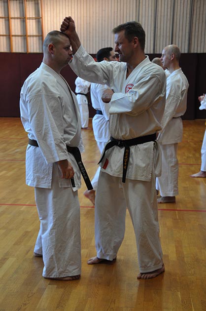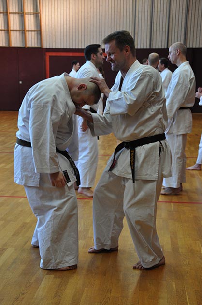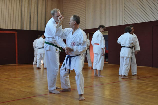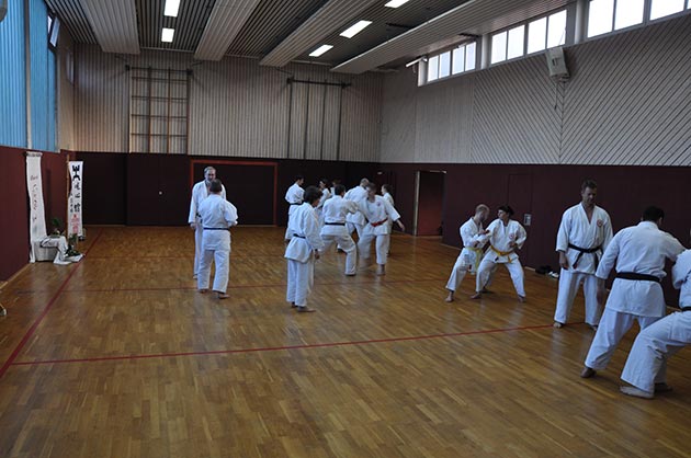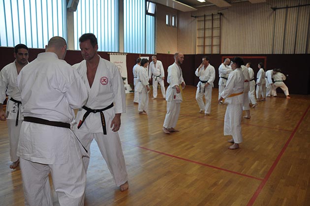 Ch. Kleuter erläutert anhand der Kata Gakisai-Dai-Ichi verschiedene Aspekte zum Lesen und Kämpfen einer Kata. Die Teilnehmer konnten die Unterschiede praktisch ausprobieren und erfahren. So entstand ein Austausch, wie mit einer Kata umgegangen werden kann. Das kampfkunstorientierte Lesen und Kämpfen der Kata ist für Ch. Kleuter ein unverzichtbarer Baustein, wenn jemand die Kampfkunst erlernen möchte. So muss der Karateka wissen, dass die Kata zum Lesen genau nach der alten Tradition gemacht werden muss; ohne eigene Veränderungen und Befindlichkeiten. Beim Kämpfen einer Kata kommt es angelehnt an die traditionelle Form eher darauf an, dass der Karateka die Techniken auch gegenüber dem vermeidlichen Aggressor zweckmäßig anwenden kann. Diese Unterschiede sind für einen Kampfkünstler wichtig zu verstehen, da eine Kampfkunst letztendlich kein Selbstzweck ist, sondern zum Kämpfen entwickelt worden ist und nicht zur Darstellung verschiedener Techniken und Abläufe gegen ein Imaginären Gegner .