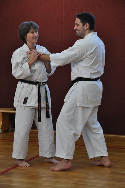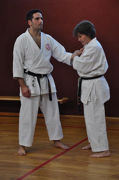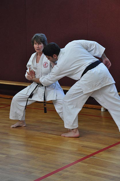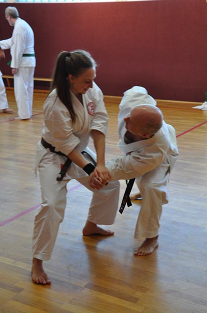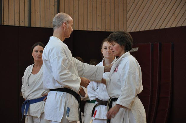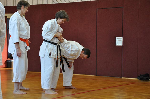 Im Anschluss hat N. Hiller den Teilnehmern aus der Kata Saifa verschiedene Abläufe erläutert, in dem sie die Grundprinzipien aufzeigte und bei der Umsetzung der Techniken am Partner darauf achtete, dass die Techniken genauso umgesetzt wurden, wie sie in der Kata gezeigt werden. So konnten die Teilnehmer an Hand verschiedener Abschnitte aus der Kata erfahren, wie die jeweiligen Techniken in der Anwendung funktionieren. Zudem wurden auch Varianten der Grundtechniken gezeigt, so dass jeder, ob groß oder klein, für sich etwas mitnehmen konnte.