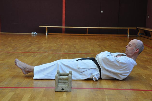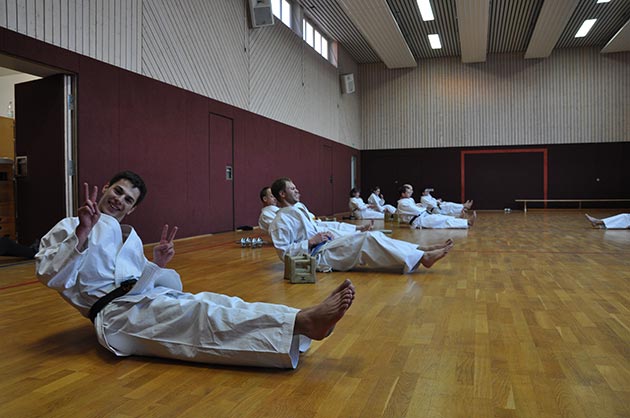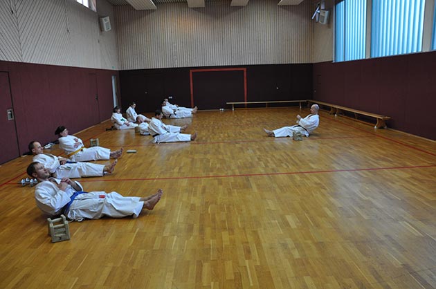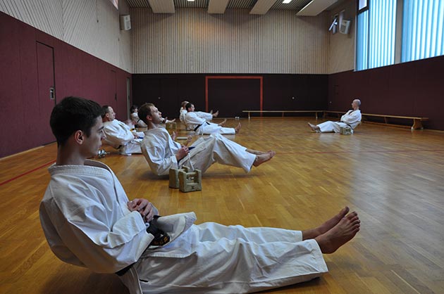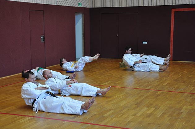 Nach einer kurzen Pause ging es dann weiter mit G. Mangels, der den Teilnehmern noch mal richtig eingeheizt hat. Bei Kraft-Konditions-Varianten kamen auch unsere Ischi Sachis zum Einsatz. Dieses alte Trainingsgerät wurde uns schon in einem Lehrgang im Frühjahr von A. Lehman nahe gebracht. Verschiedene „quälende“ Übungen zum Kraft- und Konditionsaufbau wurden gezeigt.